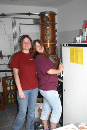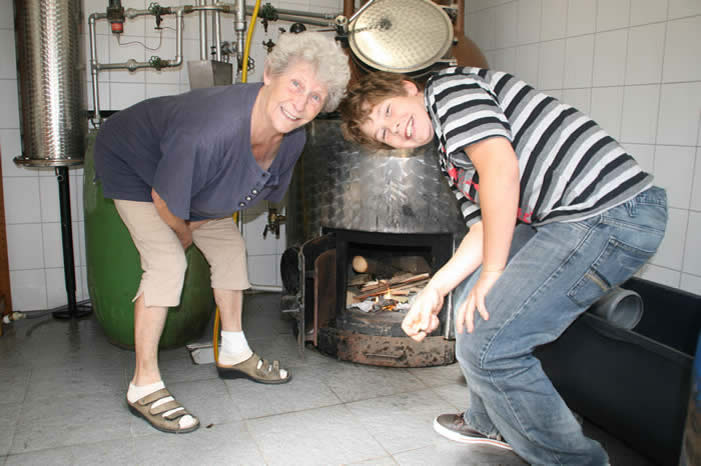 Meine Mutter - die vormalige Betreiberin der Brennerei - und ihr Enkel Julian beim Anzünden des ersten Brandes. Mit Julian wächst die 5. Generation von Schnapsbrennern in unserer Familie heran.